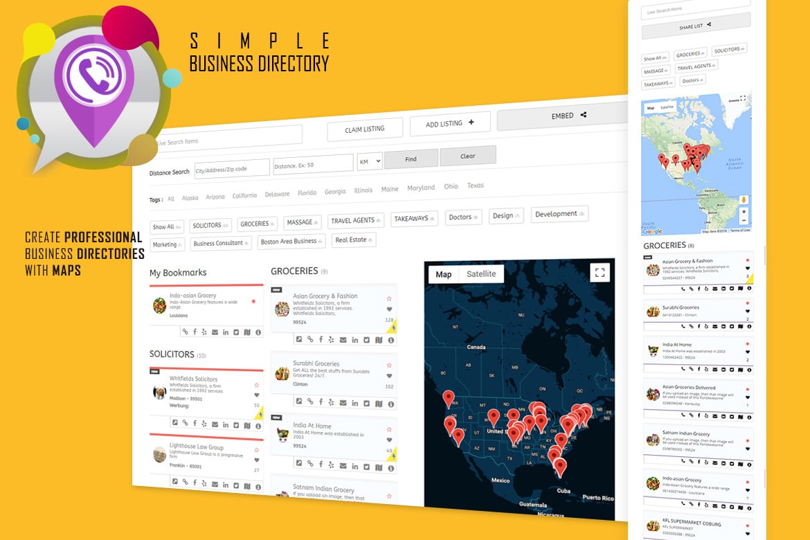Simple Business Directory ProSimple Business Directory Pro is a unique and Multi-Purpose Listing Directory WordPress plugin powered by Google Maps or OpenStreetMap platform. Create One Page Or Fully Fledged Multi Page Business Directory Listing with Geolocation Maps & Distance Search easily and very quickly. Map Only mode is supported as well. Suitable for Store Locator, Staff Directory, Employee Directory, Vendors Directory, Restaurant Directory, Company Directory, Local Directory, Contact Manager, Store Finder, Radius Search, Address Book for Intranet and much more. Supports map cluster, Paid Listing and Claim Listing with PayPal and Stripe payment.Compatible with: Any theme & Visual Page Editor like _Gutenberg,_Elementor, Beaver Builder etc..++Simple Business Directory uses Google Map with API key or OpenStreetMap without API key. Google Map which is completely free for 99% use cases. Once you add a billing account they will give you 200$ of free credit every month – recurring which is usually more than sufficient for most websites.Simple Business Directory supports Automatic Title, Description, Thumbnail, Latitude and Longitude generation. All you have to do is paste the website Link and address and the Business directory plugin will take care of the rest! This is easily the most powerful and flexible WordPress directory plugin you will ever find!Simple Business Directory is Unique, Highly Flexible, Powerful & Most Suitable for Small to Medium Sized Directories.Simple Business Directory is unique and different than typical business directory plugins. The building blocks of this directory plugin are Lists. You can create multiple Lists of business listings and show those Lists on a single page or multiple pages. This unique approach makes the plugin extremely versatile and allows you to create small or medium sized directories for any porpose from 50-5000 listings of any type in Single page and Multi page modes.Create innovative and elegant Business Directory on your WordPress website in a matter of minutes with Google Maps or OSM, Distance Search or radius search, map cluster, map marker cluster, Auto Detect User Location Upvote, Embed, Front End User Dashboard and a lot more! Turn your website into an community driven Authority website by curating niche specific useful Business directories that your users will love, bookmark, embed and share!What Can You Do with Simple Business Directory?Forget those old style boring directory styles and layouts. This innovative and powerful, yet Simple Business Directory WordPress PlugIn allows you to create and curate comprehensive Business Listings and Map Directories with detailed business information, paid listings, radius searches and Tap to Call feature with ease.### Create a Single Page Directory or Multi-Page DirectoryDo you need a small directory to be shown on a single page with Live search, filters, maps and tags?This simple business directory plugin will let you do that within a few hours. It is the most perfect solution for one-page directories embedded on a page or as resources page.Do you need a large directory that needs to span across many pages with categories and filters?This powerful business directory plugin will let you do that in the quickest possible time. Just add a single shortcode on any page and the plugin will automatically display all your Business Categories, Business Listings, and Business details hierarchically on its own pages.You can also use Simple Business Directory without Maps or Just the map!### A Directory full of Useful ToolsWith 12+ styles, 15 different modes and over 30 shortcode parameters that are easily accessible with a shortcode generator – Simple Business Directory is the easily best WordPress Directory plugin you will find. It is full of useful tools that will make your life easy. For example, for each directory listing you can upload your own image, or choose a font awesome icon with two clicks or auto generate a thumbnail from the business website link through Google in just one click! Title, Description, Latitude and Longitude can also be auto populated. You can create your own custom, extra fields that will show with each Listing. Manage all the languages from the backend – we got you covered. Have a large directory of listing that needs to be shown in Map only mode? SBD supports Map Cluster. Frontend Dashboard for the users to submit or claim a Listing for free or a payment, change listing owner, embed directory on another website or add a listing to user’s own favorite list – SBD is a complete directory solution with such powerful and useful tools.