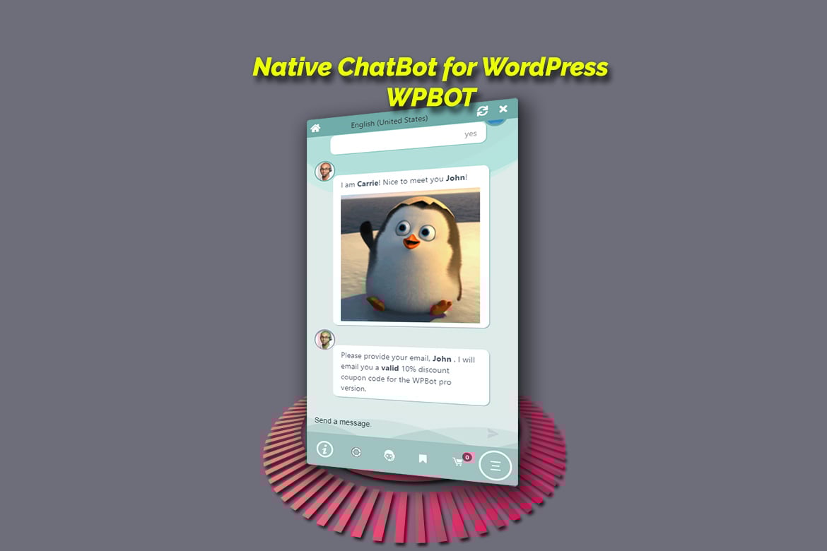 Get the Most Advanced, Native ChatBot Plugin for WordPress – WPBotMore Leads, Conversions and Satisfied customers! WPBot is the first & only native Plug n’ Play WordPress ChatBot that can improve user engagement, provide support, answer questions & increase conversions!What Can this ChatBot do for you?WPBot can converse fluidly with your users, improve customer satisfaction and Conversion rates. It can s****earch your website, s****end/collect eMails, user feedback & phone numbers . Create bot responses from the WP backend, build conversational forms, integrate with messenger, WhatsApp, open ai , DialogFlow Rich Messages & Card responses! Use Onsite Retargeting to show special offers, email subscriptions & messages on Exit Intent and a lot more!WPBot ChatBot Features———————-### Personalized, Persistent, 24/7 ChatBotA personalized welcome message goes a long way to light up one’s day. WPBot can greet returning users or show your message in the notification area. What is worse than not having a live chat on your website? It is getting a “No one is Available to Chat†message. WPBot is always there to help your site users.### Plug and Play ChatBotUsually, chatbots need extensive training and integration. WPBot is plug n’ play. If your website is in the English language – you can simply Install WPBot, set your email and you are ready to go. For other languages – you can change all the bot responses from the backend in 15 minutes. Of course, you have the option to take it all the way and really make the ChatBot intelligent with machine learning and AI using Dialogflow!### Artificial Intelligence & NLPWPBot is Intelligent. Integrated with Google’s Natural Language Processing (NLP) and AI through DialogFlow V2. It is capable of Small Talk, can carry on a conversation flow and fulfill any reasonable request. The feature is optional and initial training data is bundled with the plugin.Once AI is enabled with an agent API key, WPBot is fully integrated with DialogFlow and it will automatically match against the intents you created inside Dialogflow including follow up intents, facebook rich message, card options etc.### How the ChatBot WorksWPBot follows a streamlined algorithm and workflow to fulfill a user request. See the diagram below to understand how the ChatBot works:### User Intent Detection from Natural Language InputWPBot Works Based on Two Types of User Intents for Commands.Predefined intents can work without integration to DialogFlow API and AI. These are readily available as soon as you install the plugin and can be turned on or off individually. Predefined Intent examples are Simple Text Responses (created inside WordPress backend), Website Search, eMail subscription, Call Me Back, Feedback Collection, Frequently Asked Questions, Support eMail etc.Custom intents give you the option to build a truly human-like, intelligent and comprehensive chatbot. Build any type of Intent and Responses (including rich message responses) directly in DialogFlow and train the bot accordingly. When you create custom intents and responses in DialogFlow, WPBot will display them when user inputs match with your Custom Intents along with the responses you created. You can also build Rich responses by enabling Facebook messenger Response option.WPBot also supports Rich responses using Facebook Messenger integration and Cards. This allows you to display Images, Cards, Quick Text Reply or Custom PayLoad inside the ChatBot window.### Integrated FaceBook Messenger Live Chat and MoreIntegrate FaceBook Messenger experience directly into your website. This allows your customers to interact with your business any time with the same personalized, rich-media experience they get on FaceBook Messenger Live Chat! This feature is completely optional and is not required for normal chatbot activity.The main purpose of this feature is to provide a Live chat channel for support in addition to the chatbot.### Onsite Retargeting, Remarketing, Conversion Optimization, Exit IntentRecover up to 15% of Abandoning Visitors with Onsite Retargeting. WPBot detects exiting Visitors and displays a targeted offer to your visitor determined by you. Up to 25% of retargeted visitors will respond to your message and turn into customers. Targeted offers can be a coupon code, free ebook or any exciting offer of your choice!The Onsite Retargeting helps your Conversion rate optimization by showing your special offers and coupons on Exit Intent, Time Interval or Page Scroll Down inside the chatbot window. Get rid of those other Exit Intent popups with a chatbot that talks directly with the shopper. Reduce Abandoned Cart by showing timely messages with the Chat Bot!All of these will translate into a much higher rate of customer conversions by reducing the potentials for bounce backs.### Simple Text ResponsesCreate unlimited text responses from your WordPress backend. The ChatBot uses an advanced search algorithm for natural language phrases matching with user input.### Newsletter SubscriptionWPBot can prompt User for eMail subscription. Link this with your Retargeting ChatBot window popup and a special offer. People can register their email address that you can later export! GDPR compliant with unsubscribe command option from the ChatBot!### ChatBot Widget ShortCodeWPBot provides a handy ChatBot widget that you can place anywhere on any of your pages inline using a handy shortcode! This unique feature opens up a lot of new and unique possibilities to use the ChatBot in innovative ways! When you use the ChatBot widget shortcode on a page, the floating ChatBot icon is automatically turned off for that page.### Click to Chat LinkUse the Click to Chat shortcode so people can click on a text link anywhere from your contents and open the ChatBot window! This allows you to have a Call to Action link for chatting with the Bot and find out more information and answers to questions a user may have.### Embed WPBot on Any Other We