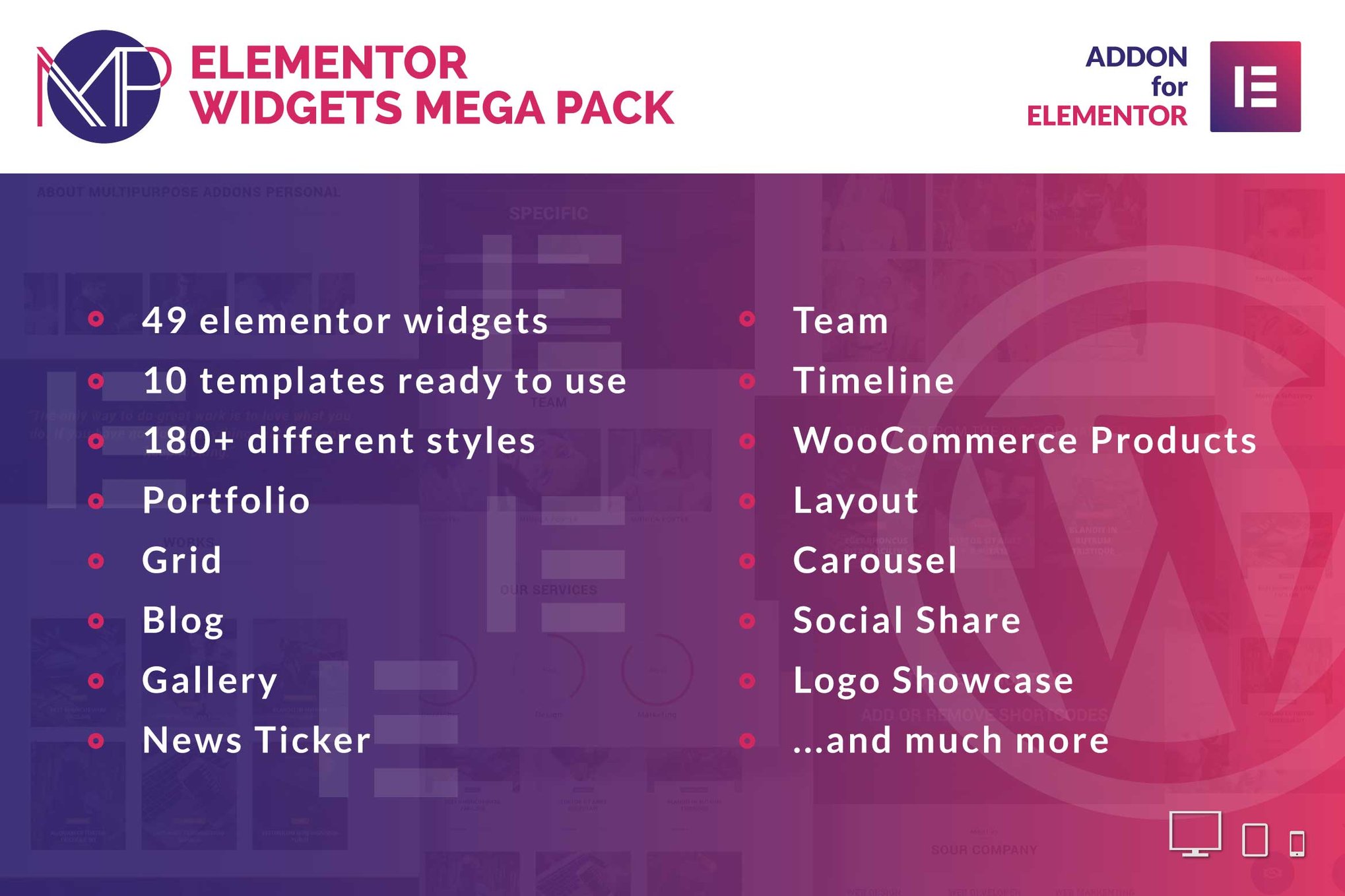 Welcome to Elementor Widgets Mega Pack. With this awesome plugin you have available 49 elementor widgets and 10 templates ready to use and 180+ different styles for Elementor.Required Elementor installed if you want use this plugin. Because this is an addon for ElementorWidgets List:Portfolio (7 Different Styles)Grid (8 Different Styles)Carousel (8 Different Styles)Social ShareLogo ShowcaseBox MessageCounterCountdownBar ChartPie ChartCall To ActionBlog Carousel (6 Different Styles)Blog (6 Different Styles)Faq (3 Different Styles)Fast Carousel (10 Different Styles)Fast Gallery (12 Different Styles)Fast Gallery Mosaic (10 Different Styles)Fast Media Gallery (13 Different Styles)Header Blocks (4 Different Styles)Mega Post Carousel (5 Different Styles)Mega Post Display (5 Different Styles)News Ticker (2 Different Styles)News Carousel (5 Different Styles)News (11 Different Styles)Team (7 Different Styles)Team Carousel (7 Different Styles)Timeline (2 Different Styles)WooCommerce Add To Cart ButtonWooCommerce Products Layout (6 Different Styles)WooCommerce Products Carousel (6 Different Styles)WooCommerce Products Showcase (10 Different Styles)WooCommerce Products Gallery (10 Different Styles)WooCommerce Products TabWooCommerce Sale Products (6 Different Styles)WooCommerce Sale Products Carousel (6 Different Styles)