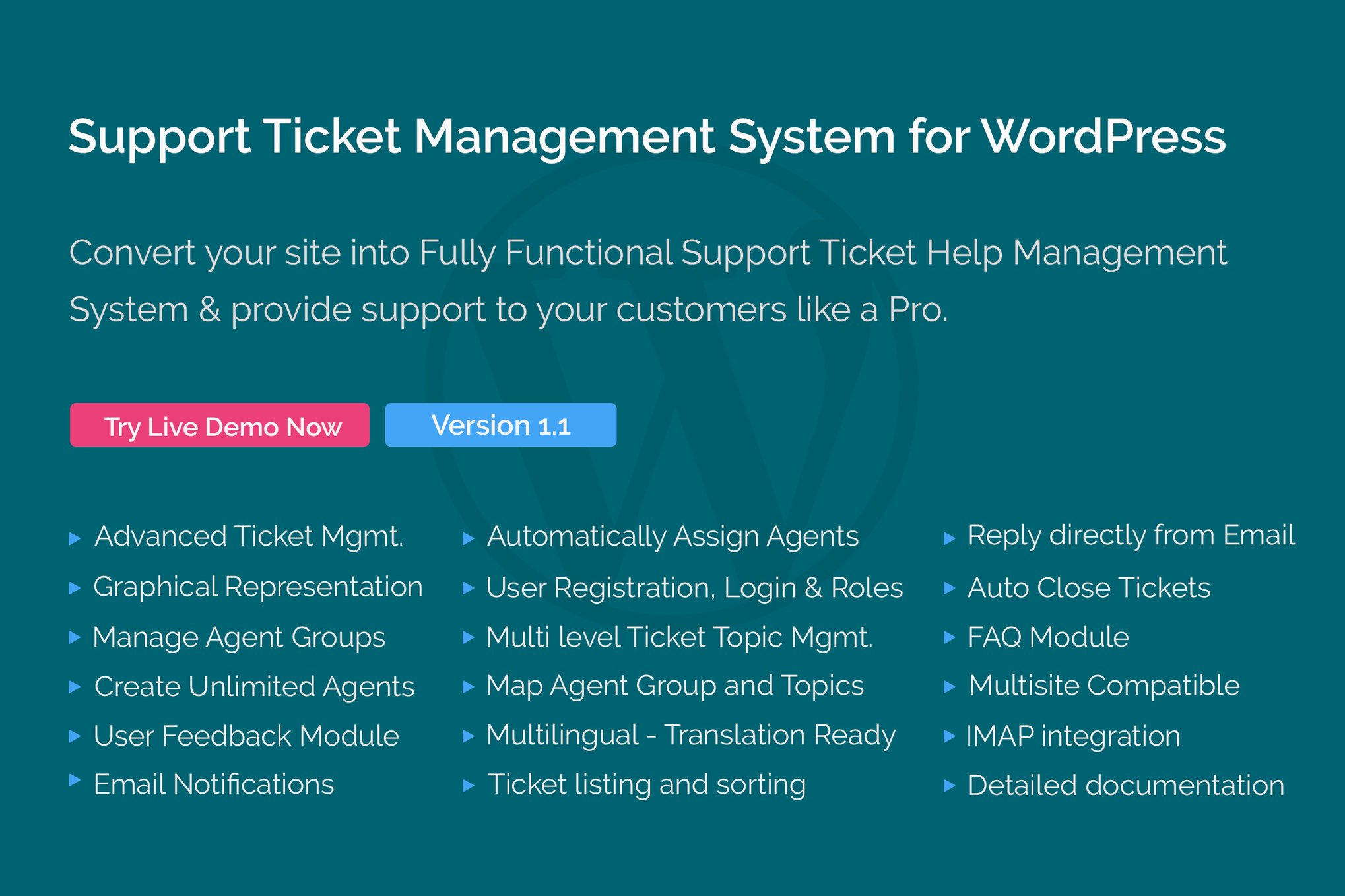 Convert your WordPress into Fully Functional Support Ticket Help Management System and support your customers like a Pro.For All Plugin demo links, please visit the plugin description page on CodeCanyon.Plugin FeaturesAdvanced Ticket Management: Manage your client’s support requests like a pro using this ticket management system. This plugin is built in a manner that any company regardless of how small or big can use it.Create Unlimited Agent Accounts: Create unlimited number of agents, Agent administrators and agent groups without any restrictions and extra expenses. No need to pay on per agent basis to all the expensives help desk services.Graphical Representation: Represent all the reports and data graphically and analyse your services like a pro. Various statistics regarding tickets, agents, groups, feedbacks, ratings, clients etc. can be view graphically with this plugin.Create Agent Groups: Manage your agents by creating agent groups. Agent Groups can be mapped with ticket topics. Ticekts can be assigned to agent groups or group admins for easier ticket allocation. Make groups of different deparments and map them with ticket topics for faster and easier ticket processing. You can do so much more with this feature.User Feedback Module: Once a ticket is solved, you can send a email to your user, asking for feedback on the support received. The user can leave a rating and feedback comment.Email Notifications: Various email notifications are sent directly from the plugin at various stages of ticket. Email notifications are sent both to site admin and ticket creator at various points of interactions. All the emails sent can be configured from the plugin settings panel.Automatically Assign Agents: You can automatically assign agents as soon as the tickets are created and thus save lot of time and hassle. Agents can be assigned automatically using various methods as per your company or product requirement. You can choose to assign ticket to any agent, agent group, agent admin or group admin as per your needs. You can even assign tickets in loop order or can assign ticket with agent with lowest number of tickets. This way you can divide work easily and equally among your agents. You can even map ticket topic with agent groups and assign based on selected ticket topic. There is some much more this feature can do to make your life easy while managing tickets.User Login & Registration Module: Any user can register, login and reset password from your website using this module. Proper email verification is done before activating user account. A client or agent both can manage their tickets after login on site.Multi Level Ticket topic management: All the tickets created are categorized by a topic. You can create topics in multi level heirarchy. Topics can be mapped with agent groups and can thus helping in auto assign tickets based on topics.Map Agent Groups & Ticket topics: Map ticket topic with agent groups and auto assign tickets to agent groups based on selected ticket topic. This helps in assigning the tickets to your agents fast and accurately. You can manage and save a lot a time and hassle using the module.Multilingual – Translation Ready: This plugin can be translated in any lanaguage. Proper translation files in .po and .mo format are included in the package. You can translate the plugin in any language of your desire.Multisite Compatible: This plugin is multisite compatible. It can installed individually on each site on your multisite network.Ticket Listing and Sorting: The ticket listing module helps in detailed view of all tickets in one place. Tickets can be sorted based on various columns in ascending and descending order.Client can reply directly from his/her Email account: Your clients can directly reply to the ticket from the email itself, without visiting the website. Ticket Comment / reply can be done from the site as well as from email. IMAP settings are configured in this plugin and replies can be fetched from your email account. Moreover email attachments can be fetched and stored along with comment in your website.Auto Close Tickets: Solved tickets can be marked as closed automatically after a certain period of time. Time can be configured from plugin settings panel.FAQ module: There is an inbuilt FAQ (frequently asked questions) module integrated in this plugin. You can create question and answers related to your product or site and display them to any visitor on your site. In case if the user is not able to find proper answer he/she is looking for from this FAQ section, then he/she can create a new ticket asking for support on your site.Various User Roles: Various user roles are integrated in this plugin for better categorization and user management. Client, Agents, Agent Admins are different user roles that can be assigned to a user. Agent group admin can also be managed after creating an agent group.IMAP integration: This plugin also comes with a feature to receive email reply as ticket comments. Means a ticket creator can reply to a email and it will be stored as comment in the system.You can configure your email account IMAP settings securely in this plugin.Detailed Documentation: Very well developed and detailed documentation is included in the package. All the features and steps are with proper screenshots. In case of any doubts, you can always visit the documentation.